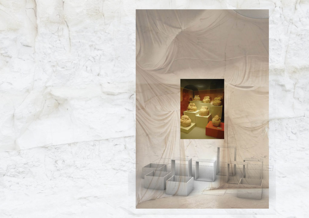 Georgia Tegou and I met for the first time in London and entertained the idea of how museums and their visitors intervene, contribute and appropriate their artefacts, because so much about them is shrouded in mystery. With the sleeping lady and the venuses of Malta, in Ochre we found ourselves doing just that. We have crafted the set and costumes of this piece to create tools which the dancers use to create a dramaturgy as the piece progresses. We started the process with images of caves, wombs, a heart beat, the sun and museum plinths, and crafted out of them a new language for the piece to the sounds of the original score by Liran Donin.